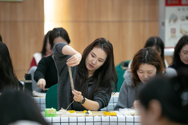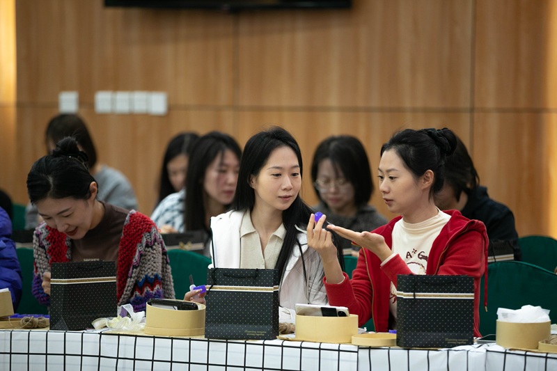 老师一边讲解穿绳打孔的技巧,一边展示如何将零散的“葡萄”串联成串,女职工们听得聚精会神,对即将进行的指尖创意,充满着期待与喜悦。