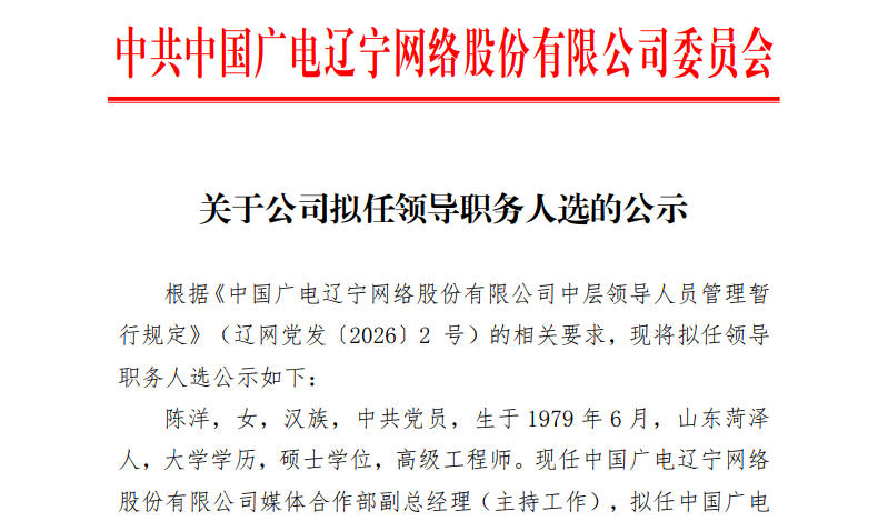 根据《中国广电辽宁网络股份有限公司中层领导人员管理暂行规定》(辽网党发〔2021〕3 号)的相关要求,现将拟任领导职务人选公示如下: