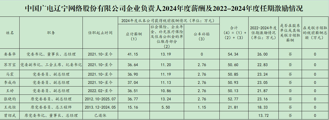 中国广电辽宁网络股份有限公司企业负责人2024年度薪酬及2022-2024年度任期激励情况